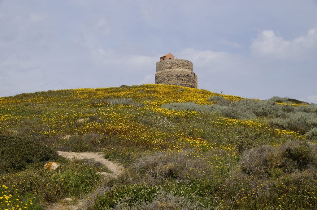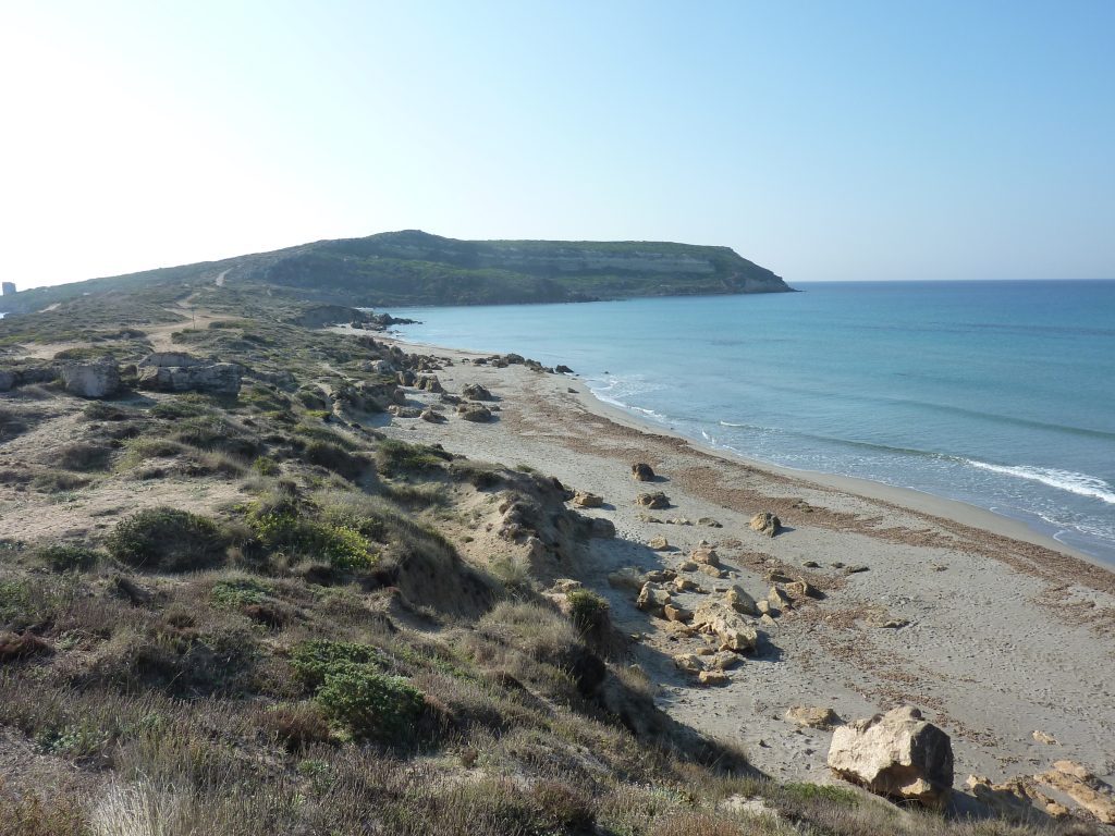 Für Tharros sollte man sich extra Zeit nehmen, denn dies war früher schon eine sehr moderne und fortschrittliche Hafenstadt, dies ist dann aber einen  extra Bericht wert. Rechterhand auf derselben Wegstrecke  auf dem Berg trohnt der Torre di San Giovanni, den wir auf dem Rückweg noch bestiegen. Es geht wieder leicht den Hügel hinunter und wir kamen auf der rechten Seite an einen kleinen Sandstrand. Wer jetzt seine Badesachen dabei hat, kann hier ein wenig dem Badespaß frönen, im Sommer natürlich.